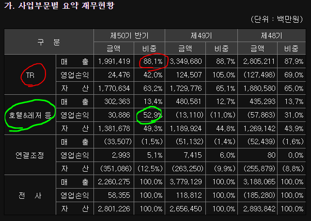 그런데, 왠걸. 코로나19가 터지고 하늘길은 막론하고 집 밖에도 사람들이 나오지 않고 있으니 면세, 호텔, 레저사업이 잘 될 수가 없었다. 직격탄을 맞은 것이다. 하지만, 코로나가 영원할 수 없듯이 리오프닝 관련해서 가장 수혜받는 회사 중 하나로 스포트라이트 받던 호텔신라. 20년부터 22년 반기말까지 TR, 호텔&레저 매출이 점차 회복한 것을 볼 수 있다. 다만, 흥미로운 점은 TR부분의 매출이 전체 매출 중 88.1%나 차지하지만, 실제 영업이익에서는 호텔&레저가 매출액 대비 영업손익을 더 많이 번 것으로 보여진다.