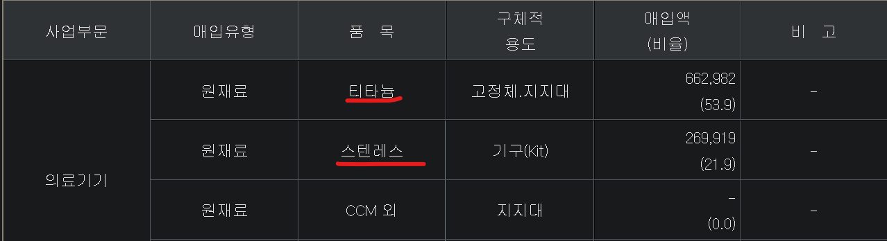 하지만, 디오의 원재료매입현황을 보면, 지르코니아는 보이지 않아요. 티타늄이 대부분이고 그 외 의료기기에 들어가는 STS(스테인리스스틸)가 주이죠.