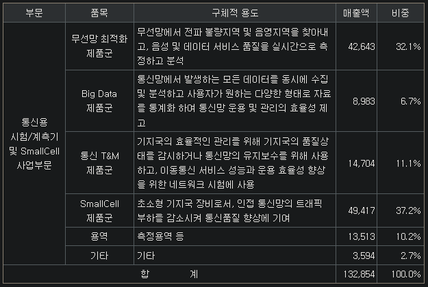통신T&M은 Test & Measurement의 약자인데요. 말 그대로 기지국을 상대로 시험과 측정을 하는 사업입니다. 기지국의 현재 상태를 실시간으로 측정할 수 있는 유지보수용 휴대형 계측장비와 네트워크 시험 환경을 가상으로 구현해 주는 채널 에뮬레이터 등, 통신 네트워크 성능 시험과 운용의 고도화를 위해 사용됩니다.