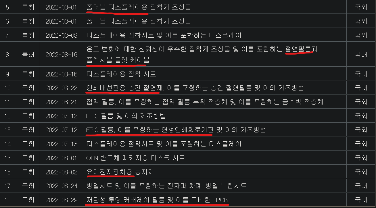 특허기록도 살펴볼까요. 소재특성상 특허기록이 많은데요. 핵심만 살펴보면, OLED와 FPCB관련 특허가 상당히 많은 것을 알 수 있어요. 반도체 패키지용 소재특허는 22.08.01일자에 하나 등록되어있네요. 매출순으로도 OLED소재 > FPCB소재 > 반도체PKG소재이니 이해할 만합니다.