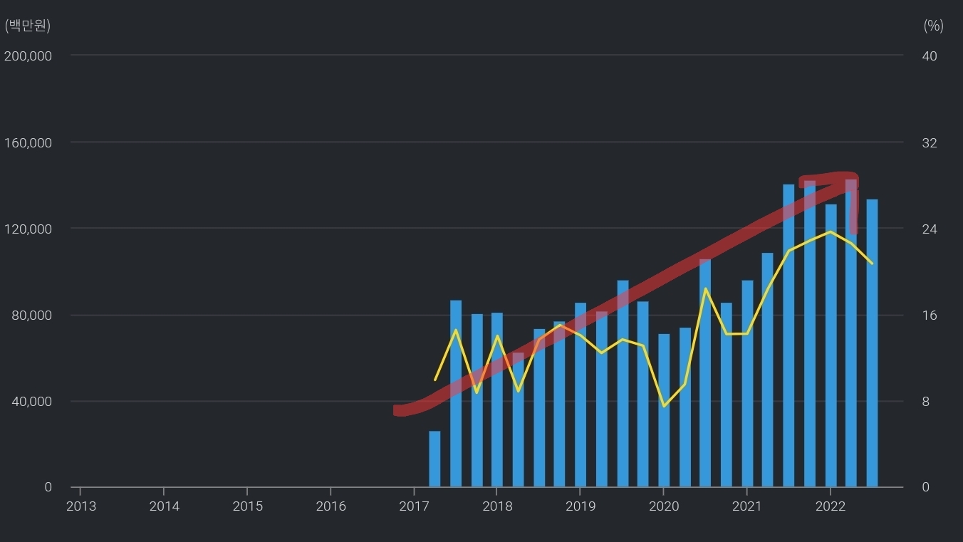 매출액, 영업이익률 모두 우상향 중 : 최근(23.1.12일) 전방업체 OLED 재고부담으로 매출 감소 중