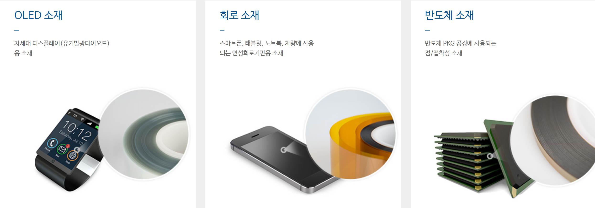 이녹스첨단소재는 2017년 (주)이녹스로부터 인적분할을 통해 신규설립되었어요. 이녹스첨단소재는 3가지 '소재'라는 사업을 하는 기업입니다. OLED소재, FPCB소재, 반도체PKG소재 입니다.