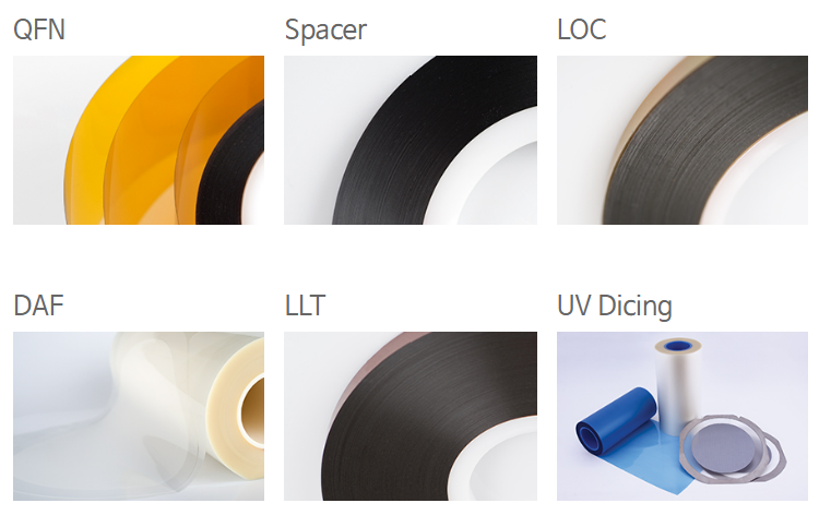 · UV Dicing Tape : 패턴형성이 완료된 Wafer를 개별 칩분할 또는 개별 패키지로 분할 할 때 웨이퍼를 지지