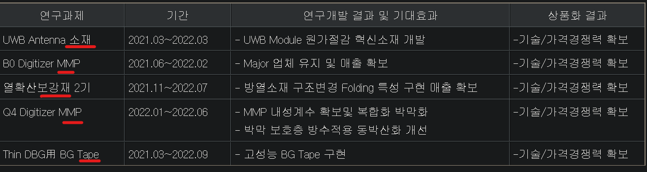 개인적으로 이녹스첨단소재의 연구실적과 연구계획을 보면 당사의 현상황과 미래 비전을 볼 수 있다고 생각을 해요. 같이 한 번 봐볼까요. 최근 기준으로 연구실적을 가져와봤는데요. 대부분의 연구과제가 '소재'라는 것을 알 수 있어요. 소재기업으로서 충실히 일하는 것 처럼 보입니다.하나만 살펴보자면, 3번째 열학산보강재 같은 경우 Folding 특성 구현을 기대한다고 나와있는데. Folding이라 하면 앞서 OLED소재에서 소개해드린 것입니다. 앞 글을 읽고 오니 눈에 보이죠.
