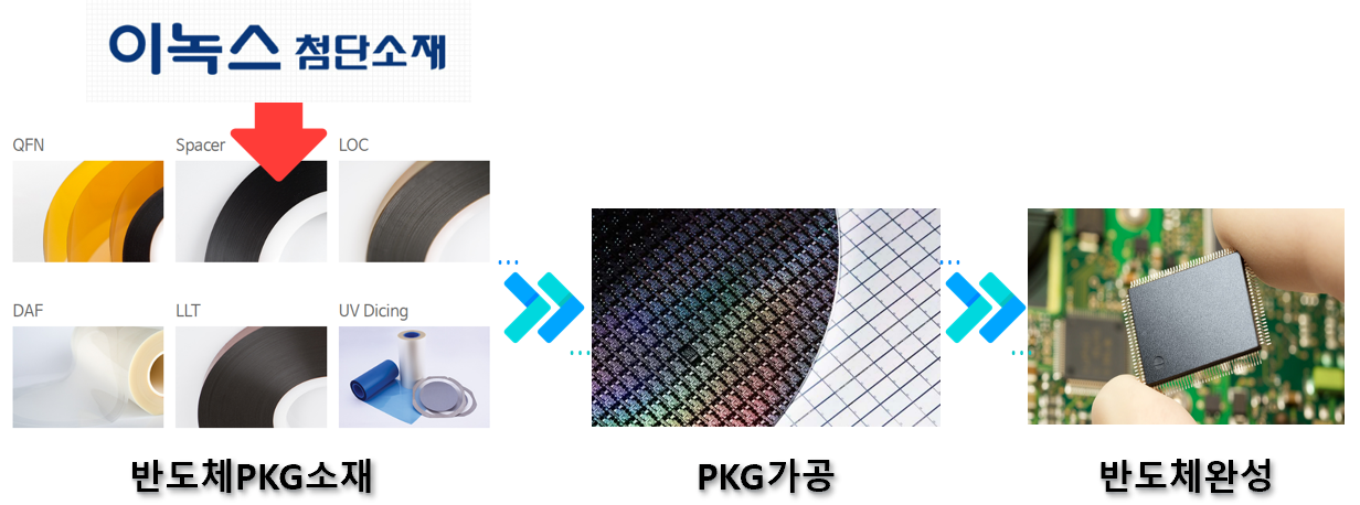 반도체는 칩과 보드를 합친 것에 불과하죠. 다만, 이것으로 끝난 것은 아니에요. 이렇게 만들어진 반도체를 보호하고 적용될 기기에 적합한 형태로 만드는 공정이 추가적으로 필요합니다(전공정이 궁금하다면 참고!). 즉, 패키징공정이라는 것이 필요한 것이죠. 자 이녹스첨단소재의 OLED소재, FPCB소재까지 보셨다면, 반도체패키지소재도 똑같다는 것을 이제 다들 아실거라 믿습니다.