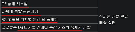 쏠리드의 아래 R&D 실적을 보면, 전부 중계기에 관한 것임을 알 수 있어요. 특히, 5G로의 통신망 전환가속화로 중계기도 5G를 감당할 필요성이 생겼죠. 더 빠르고 주파수가 높은 5G에 맞춰서 동사는 연구개발을 완료했어요.