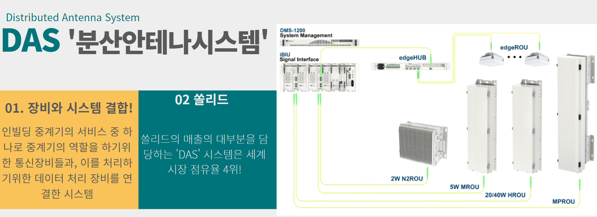 DAS는 필요한 제품들을 연결하여 만든 하나의 시스템 인데요. 사람도 각 눈, 코, 입, 귀, 손/발 등을 통해 느끼는, 시각, 후각, 미각, 청각, 촉각 등 다섯가지의 감각신호들을 뇌에서 처리하잖아요? 마찬가지로 여러 대의 통신장비들(오감)을 처리 할 수있게 데이터 처리 장비(뇌)와 연결한 시스템이라 생각하시면되요. 쏠리드의 주력인 'DAS'의 경우 세계시장 점유율 4위에요!