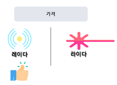 가격적인 면에서도 레이다가 저렴합니다. 피부과에 가도 레이저 시술보다는 고주파로 관리 받는 것이 가격이 좀 더 저렴하죠. 컷팅장비에서도 날카로운 칼로 자르는 것보다는 레이저로 자르는 것이 더 정밀하지만 가격은 비쌉니다. 자율주행에서도 마찬가지에요. 와이파이, 전화, 인터넷 등 우리 일상생활에서 쓰는 전파들은 가격이 비싸지 않지만 레이저는 비쌉니다.