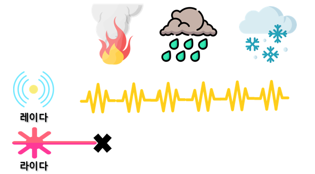 그런데, 만일 밖에 눈이 많이 오거나 안개가 끼는 등 기상악화가 일어나면 어떻게 될까요? 이때는 레이저의 정밀도가 떨어질 수 밖에 없어요. 자, 예시를 들어볼게요. 거실에서 제 동생이 레이저를 방안에 있는 저한테 레이저를 쏘려고해요. 그런데, 방문은 잠겨있죠. 그 레이저가 저한테 도달할까요? 도달하지 못합니다. 그러면, 거실에 있는 저의 집 와이파이기기는 저한테 도달 할 수 있을까요? 당연히 도달합니다. 전파는 앞에 장애물에 크게 방해를 받지 않기때문입니다. 지금 제가 이 글을 작성하고 있는 와중에도 와이파를 쓰고 있으니깐요. 이 문이 기상악화였다고 생각하면 됩니다.