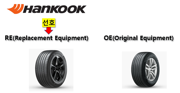 아까, 한국타이어는 RE방식을 선호하고 OE방식은 덜 선호한다고 설명했죠. 좀 더 자세하게 알아볼게요. RE와 OE의 차이는 간단해요. RE는 Replacement Equipment의 약자로 '대체'가 핵심이에요. 대체를 하려면 어느 자동차의 휠과 맞아야겠죠. 그러다보니 표준화됐습니다. 타이어업체 스스로 제작할 수 있고 대량생산이 가능하여 가격도 저렴하고 쉽게 구할 수 있죠. OE는 그 반대입니다. Original Equipment이죠. 주로, 완성차업체들이 정해놓습니다. 즉, 표준화보다는 개별 맞춤형 타이어가 목적이에요. 가격은 비싸지만, 맞춤형이기에 최적화되어있죠.