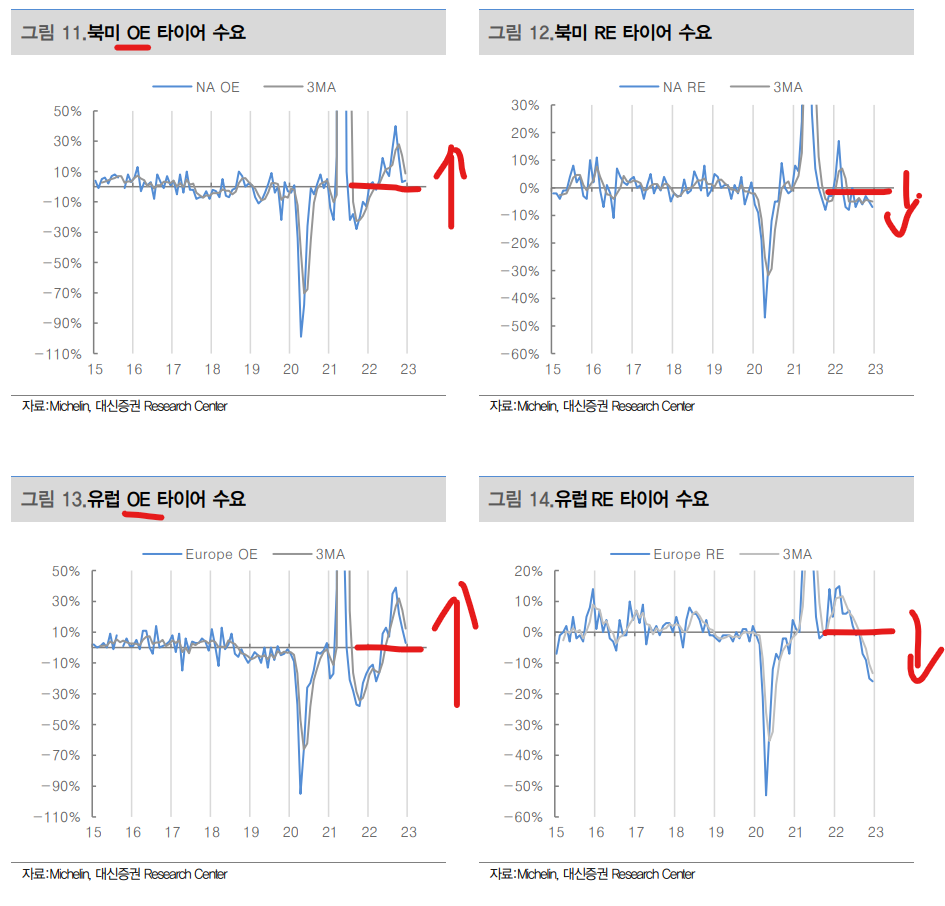 반대로, RE 같은 경우는 동사 같은 타이어업체들이 직접 생산하고 판매가도 정할 수 있기 때문에 RE부문이 수익이 높습니다. 증권사 추정 한국타이어앤테크놀로지의 RE : OE 비중은 75: 25입니다(22년말 기준). 리스크는 북미, 유럽, 중국 등 타이어수요가 많은 지역에서 RE와 OE의 수요차이를 지켜봐야하는데요. 북미, 유럽을 예시로 들면, OE타이어 수요가 0 이상의 위치해 있는 것을 알 수 있어요. RE부문은 미국, 유럽 둘다 아래에 있죠. 이러면, 수익성이 급격히 좋아지지는 않습니다.