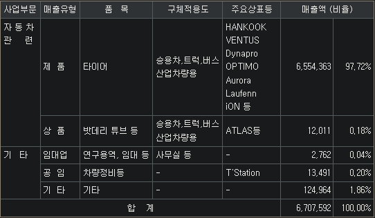 타이어(98%), 기타(2%, T-Station=차량정비) / 생산지역 : 한국, 중국, 인도네시아, 헝가리, 미국