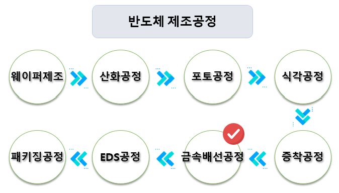 반도체를 만드는 과정은 8단계로 나눌 수가 있어요. 순서대로 나열하면, 웨이퍼제조 > 산화 -> 포토 > 식각 > 증착 > 금속배선 > 테스트 > 패키징입니다. 이중 오늘 살펴볼 것은 '금속배선공정'입니다.