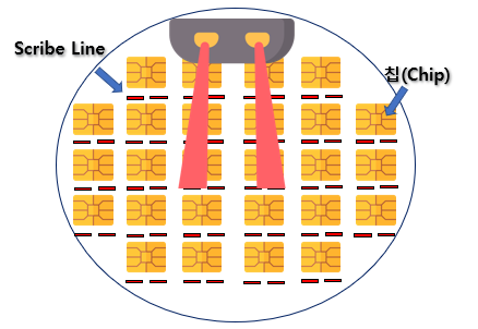 1. 웨이퍼절단 : 수많은 칩들을 스크라이브 라인(Scribe Line)에 맞게 절단