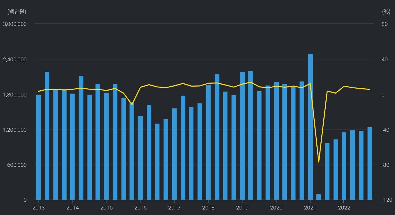 22년 경기침체로 인한 매출액, 영업이익률 동시 하락했다. 영업이익률은 평균 7~12% 사이를 왔다갔다 한다.
