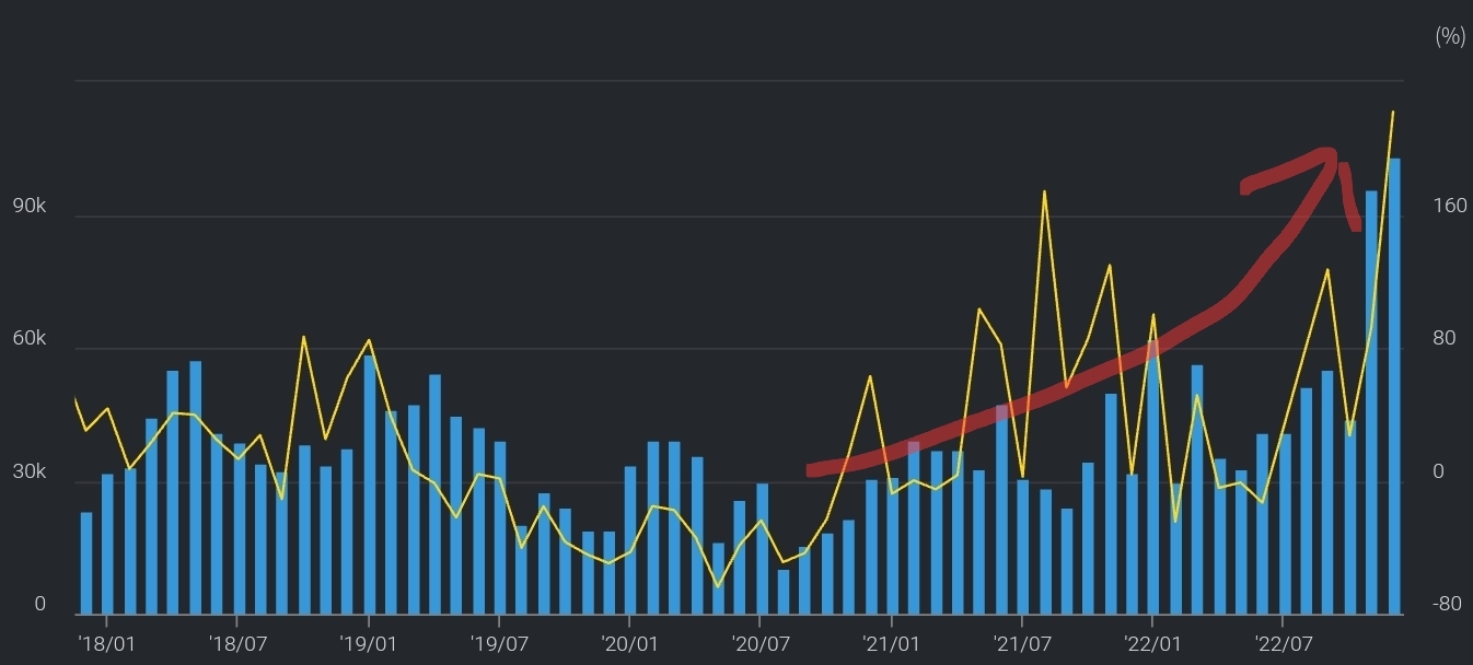 다만, 미국향 굴삭기 수출액을 보면 급격한 상승한 것을 알 수 있다. 미국의 자국내 리쇼어링으로 인한 수요증가원인으로 파악된다.
