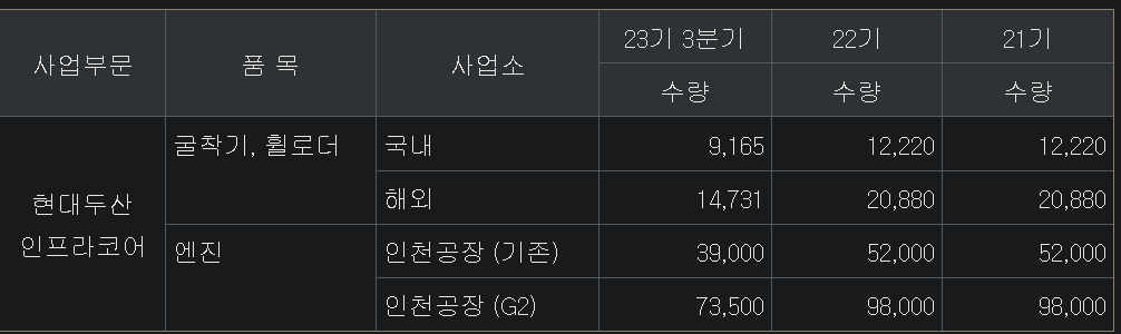 현대두산인프라코어는 엔진은 2개의 인천공장에서 생산하고 있고요. 굴착기, 휠로더 같은 중장비는 국내, 해외 나눠서 생산하고 있습니다. 아무래도, 중장비는 북미, 유럽 국가들의 수요가 많음으로 해외 생산량이 좀 더 많은 것을 아래 표를 보면 알 수 있어요.
