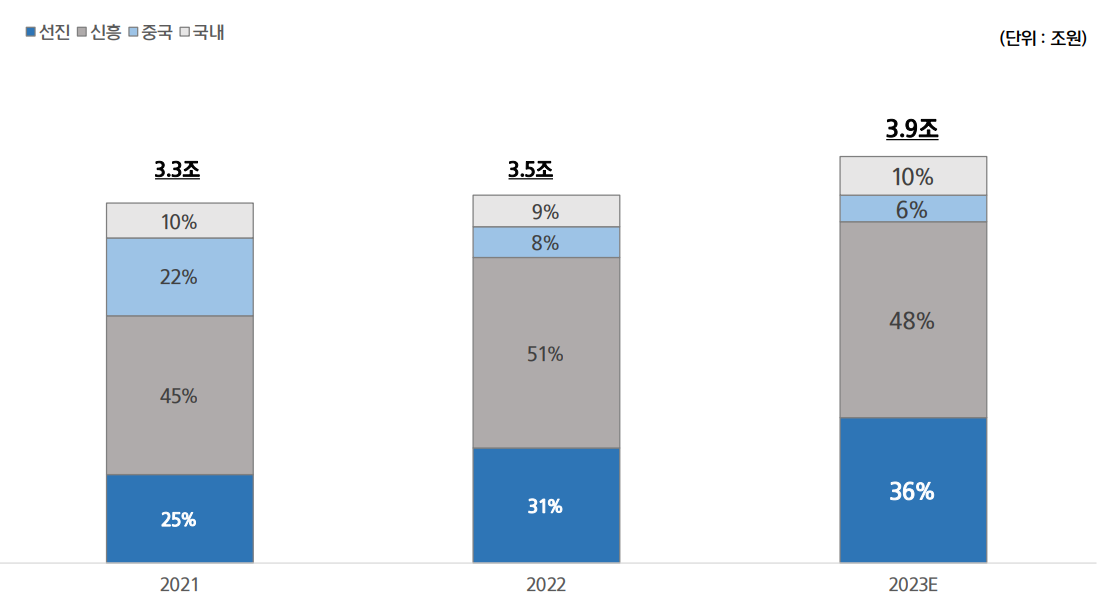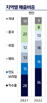 중국의 22년 코로나봉쇄로 인한 경기둔화로 매출비중 줄어듬. 다만, 선진국인 북미, 유럽 시장 호조와 신흥국 인도, 브라질의 상승으로 수혜를 만회함.