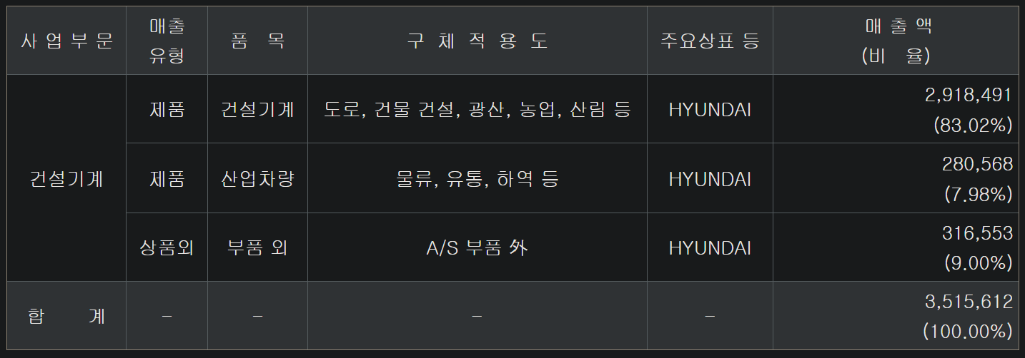 · (핵심사업!!) 중장비 제조 및 판매 : 굴착기, 휠로더 / 수출 90%, 내수 10%
