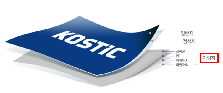 1. 이형지 : '떨어질 이(離)', '모양 형(型)', '종이 지(紙)' > 뜻 : 분리되는 필름(접착지) > 사용처 : 포장재, 전자, 의류, 신발, 가방 등