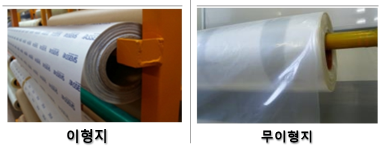 이형지와 무이형지를 만드는 장비도 다른데요. 이형지 같은 경우는 티다이캐스팅(T-Die Casting)이라는 기계를 이용해서 만들고요. 무이형지는 블로운(Blown Casting)이라는 장비를 사용해서 만듭니다.