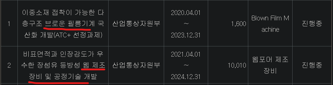 첫 번쨰 연구진행 중인 것을 보면 브로운(블로운) 필름기계 국산화개발 중이라고 나와있죠. 정부기관인 산업통상자원부와 함께 연구진행중입니다. 앞서 이형지와 무이형지는 장비도 다르게 들어간다고 설명을 했었는데요. 브로운(블로운) 필름기계는 무이형지를 위한 기계였죠. 무이형지를 만들기 위한 장비를 국산화하는 과제를 동사가 하고 있는 것으로 보입니다.