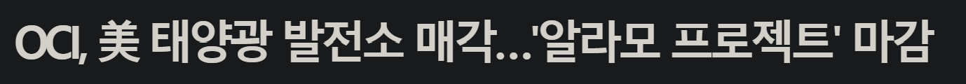 OCI는 태양광용 웨이퍼소재에 쓰이는 폴리실리콘만 만드는 것이 아니에요. 직접 태양광발전소를 짓기도 하죠. 대표적으로, 텍사스의 알라모(Alamo)프로젝트라고 총 7개 사이트에 태양광발전소 지었는데요. 이후 3개 프로젝트를 남기고 나머지 4개 정도는 처분했습니다. 태양광을 짓는 태양광업체들은 직접 운영을 해서 전기를 팔거나 부지를 매각하는데요. OCI는 절반 정도를 재무건전성을 위해 매각했습니다.