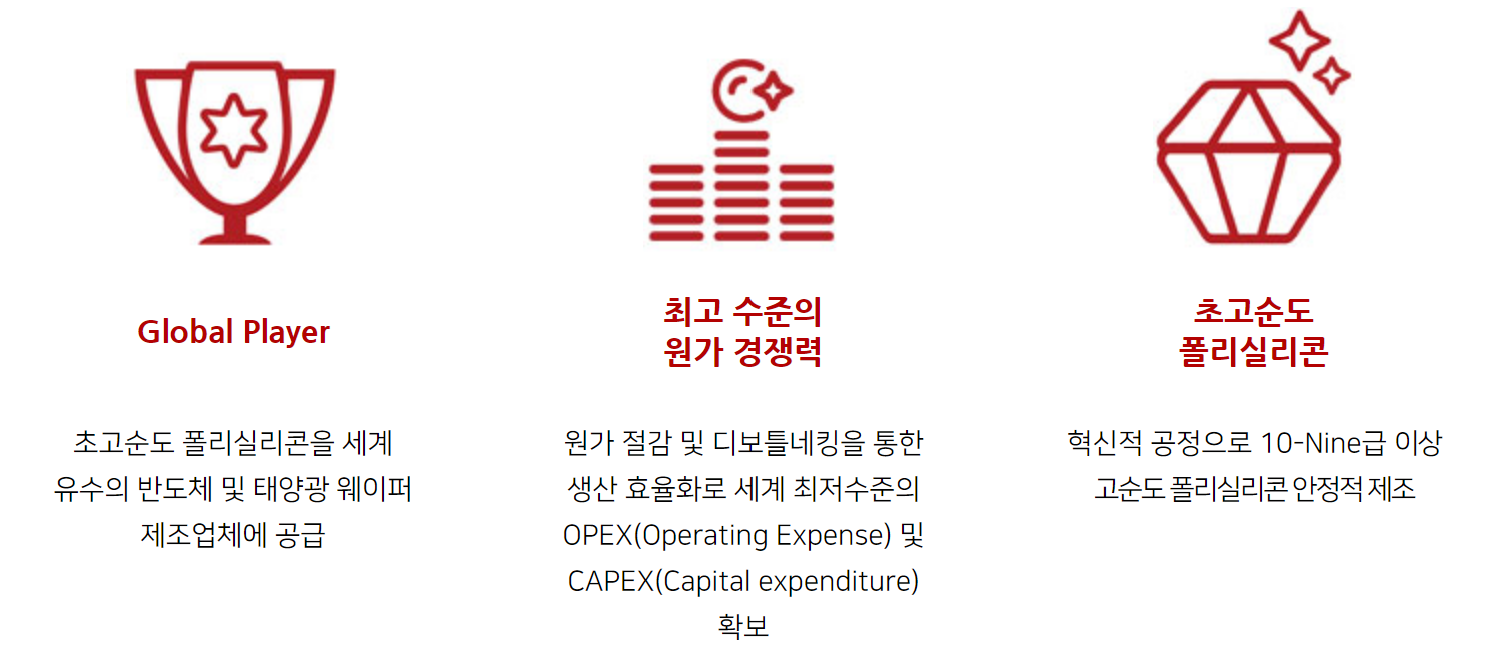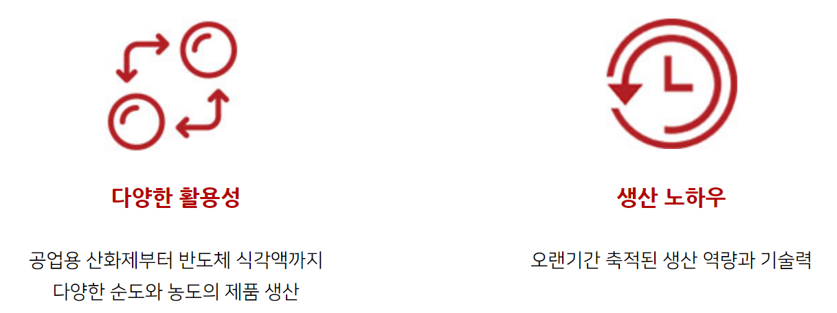 · (핵심사업!!)베이직케미컬 : 폴리실리콘, 과산화수소(식각, 산화), 고순도인산(식각, 산화), 흄드실리카(반도체, 자동차 등의 보강재)