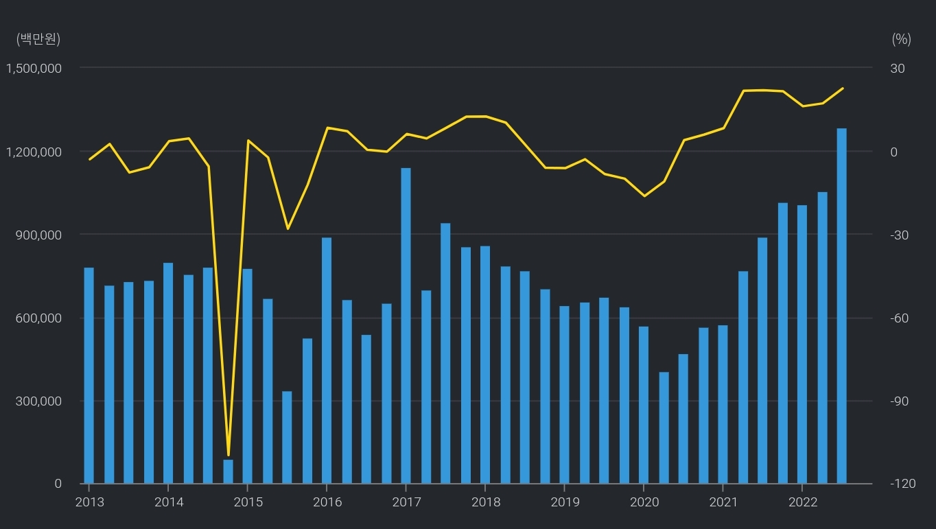 매출액 20년 이후 우상향. 영업이익률 10%중반 이상으로 양호. 다만, 경기사이클을 타기 때문에 적자나는 경우도 부지기수.