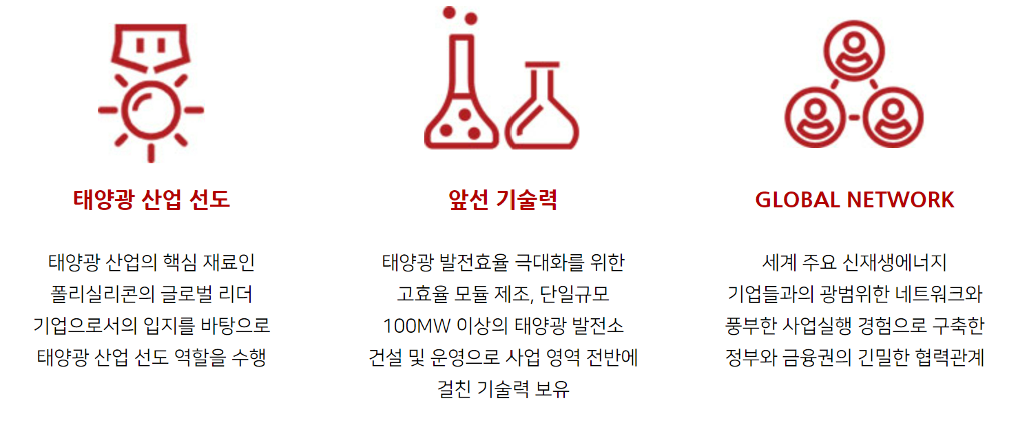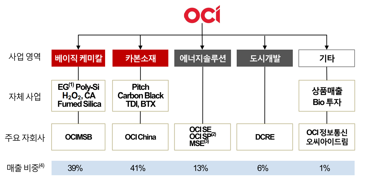 OCI는 2006년부터 폴리실리콘 사업을 시작했습니다. 말레이시아공장에서 태양광용 폴리실리콘을 연간 35,000톤 규모로 생산하고 있습니다(22년 기준). 또한, 국내 군산에서 반도체용 폴리실리콘을 4,000톤 규모(22년 기준)로 만들고 있습니다. 뿐만아니라 타이어회사에 공급하는 카본케미컬부문, 태양광발전소와 열병합발전소를 짓는 에너지솔루션부문, 도시개발사업부문까지 영위하고 있습니다.
