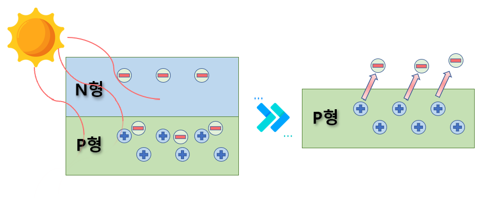 태양전지의 작동원리는 제가 올린 '태양광 쉽게이해하기'를 보고 오면, 더 이해하기 쉽습니다. 간단하게, 다시 설명을 해볼게요. 반도체는 두 종류로 나뉘는데, N형, P형입니다. N형은 -극인 전자, P형은 +극인 정공입니다. 둘이 결합을 시키면 전자가 정공으로 이동을 하는데요. 그러면, P형쪽에 전자가 상대적으로 많아 지겠죠? 이때, 이 많은 전자들을 잘 사용하면 전기로 쓸 수가 있어요. 어떻게할까요? 바로 햇빛을 받으면 P형에 있던 전자가 외부로 빠져나가면서 전류가 되는 것입니다(=광전효과). 간단해요. 자세한 설명은 '태양광 쉽게알기'를 참고하면 됩니다.