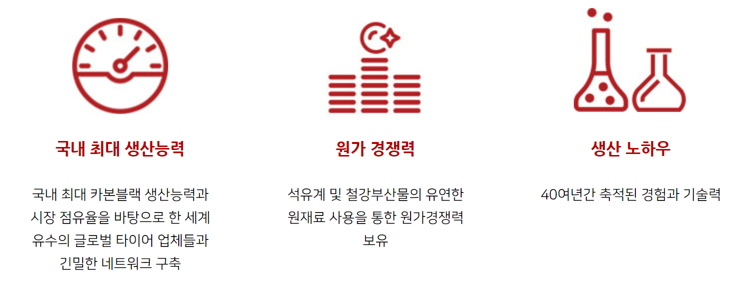 · (핵심사업!!)카본케미컬 : 카본블랙, 음극재 카본 등 (EV용 타이어 카본블랙) / 한국타이어, 넥센타이어에 주로 납품