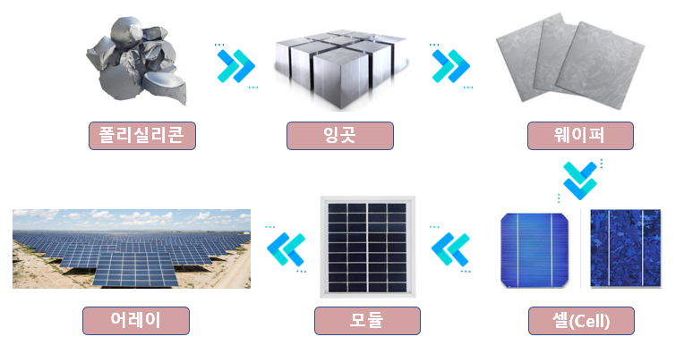 태양광을 만드는 공정은 반도체공정보다 훨씬 간단해요. '폴리실리콘 > 잉곳 > 웨이퍼 > 태양셀 > 모듈 > 어레이'단계이죠. 태양셀, 모듈, 어레이는 결국 태양셀을 몇개 합친 것의 차이에 불과합니다. 폴리실리콘에서 웨이퍼도 결국 같은 부류인 것이죠. 그림으로 봐볼까요.