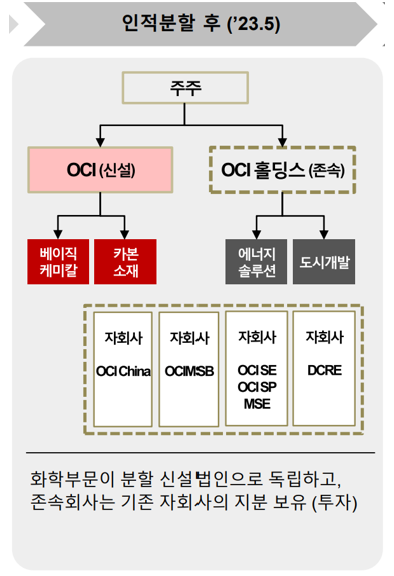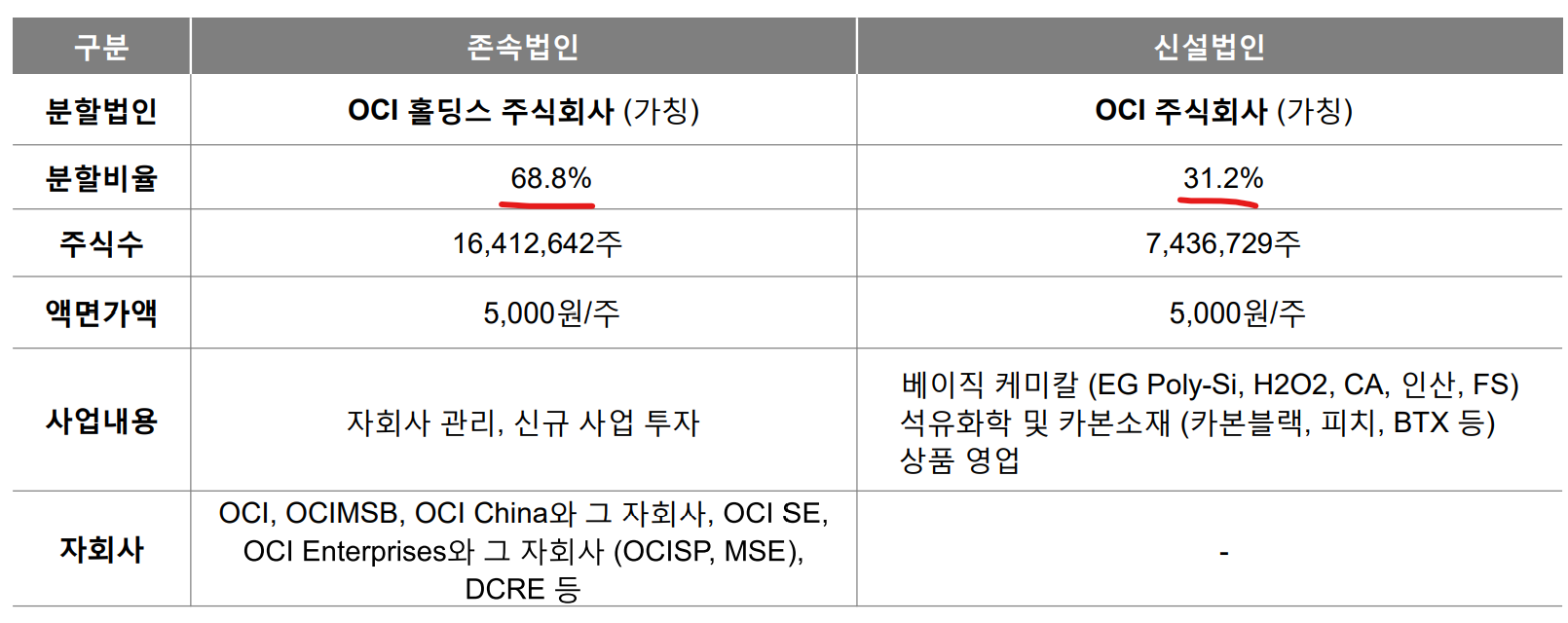 분할 후에는 매출비중이 70%가 넘는 케미컬부문(베이직 케미컬, 카본소재)를 따로 사업회사로 신규개설하기로 결정했습니다. 즉, 핵심 노른자를 OCI라는 사업회사가 하고 따로 OCI홀딩스라는 지주회사를 세워 지배하겠다는 의미입니다.