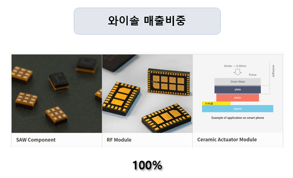 와이솔은 스마트폰에 RF Module(Radio Frequency)을 공급하는데요. RF Module이란 스마트폰에 들어오는 전자파들을 적정한 주파수만 들어올 수 있게 필터링 해주는 것을 의미해요. 와이솔은 당사 제품인 SAW Filter와 Duplexer를 반도체소자와 집적하여 RF Module을 만들고 있습니다. 주요 고객사로는 삼성전자(매출 비중50%), 중국 OYX 업체(매출 비중50%)을 차지합니다. 뿐만 아니라 적층세라믹소재를 이용한 세라믹 엑츄에이터 모듈도 공급하는데요. 압전효과로 전기를 발생시켜 햅틱기능도 실현할 수 있습니다. 다만, 이 모든 것은 IC집적회로가 들어가는데, 원재료 비용부담이 커진다는 것이 한계입니다.