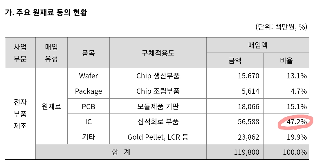 · 반도체IC 원재료 비용이 47% 차지할 만큼 원재료 비용통제 안되고 있음. 내재화 필요성 절실 > 진행 중