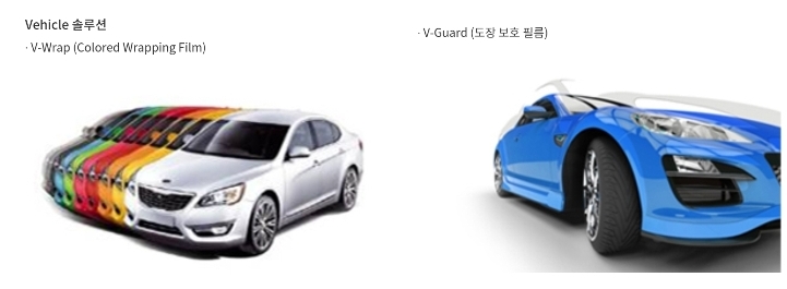 점차 전기차로 전환을 하면서 그동안 가솔린, 디젤로는 엄두를 못냈던 여러 디스플레이를 장착하여 영화를 보거나 작업을 하는 것이 점차 가능해지고 있어요. 그러다 보니, 자동차내부 인테리어의 수요도 점차 증가하고 있죠. 특히, 전기차의 무게가 내연기관차보다 250kg정도 무겁다 보니 경량화의 중요성이 커지고 있는데요. 자동차 내부에 들어가는 실내 인테리어소재들도 경량화가 되어야겠죠. 뿐만 아니라 자동차외관의 도장이나 색 관련한 필름도 제조 및 판매를 하고 있습니다.