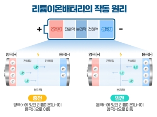 간단하게만 이차전지원리를 되짚어볼까요. 양극과 음극이 좌우에 있고 가운데 분리막이 있어요. 이때 양극에 있던 리튬이온이 음극으로 이동한다면, 충전이 되는 것이고요. 음극에 있던 리튬이온이 양극으로 이동한다면, 방전이 되는 원리인 것이죠.