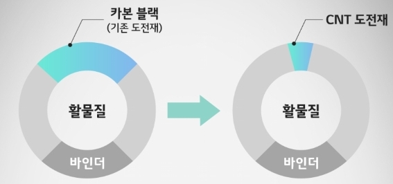CNT도전재란 기존 카본블랙을 대체하는 더 효율적인 전자이동을 돕는 녀석이죠.