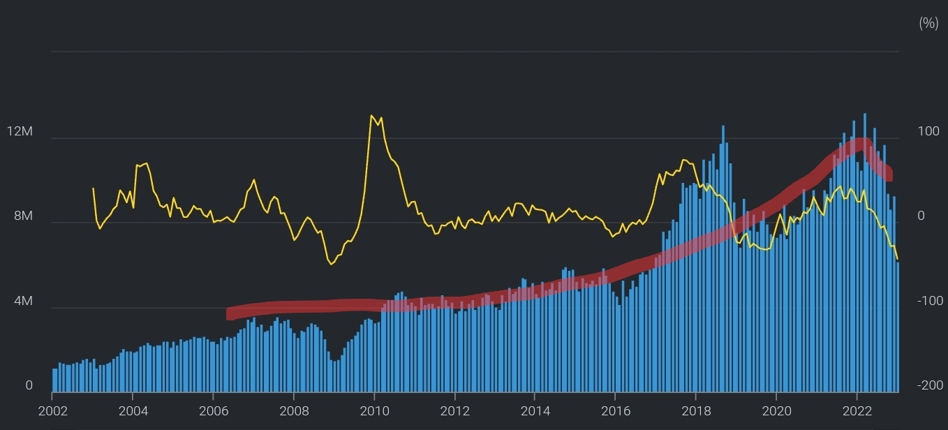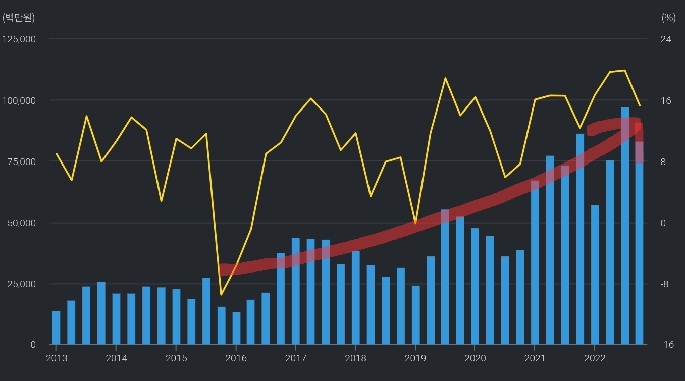 한국 반도체수출규모 추이 : 계속 우상향 중이다가 22년부터 경기침체로 하락 중