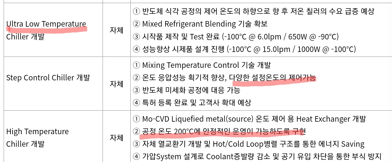 반도체, 디스플레이장비의 온도를 조절하는 칠러장비부터 봐볼게요. 칠러장비는 한 가지 종류만 있는게 아니라 역할에 따라 다양하게 포진해 있는데요. 예를 들면, 첫 번째 연구실적을 보면 점점 높아지는 반도체공정에 걸맞게 더욱 더 저온화된 칠러의 수요가 증가하는 것을 볼 수 있어요. 그렇기 때문에 Ultra Low Temperature Chiller 장비개발을 한 것이죠. 또한, 고객사마다 요구하는 것이 다르기 때문에 특정 공정에 맞는 온도를 설정을 해야하는데, 유연한 온도조절을 할 수 있는 Step Control Chiller장비 개발실적도 볼 수 있습니다.