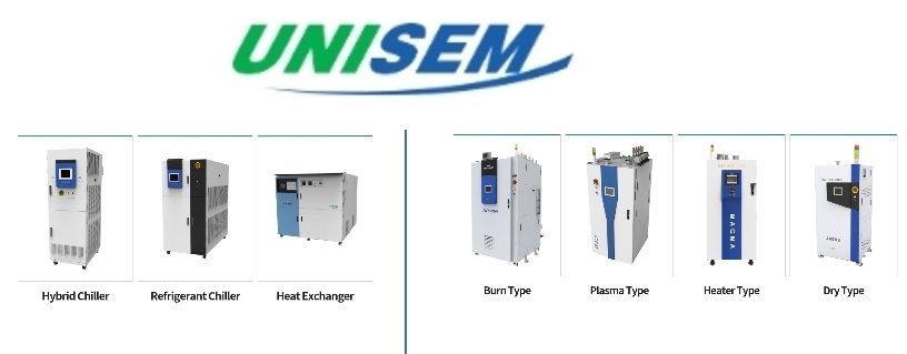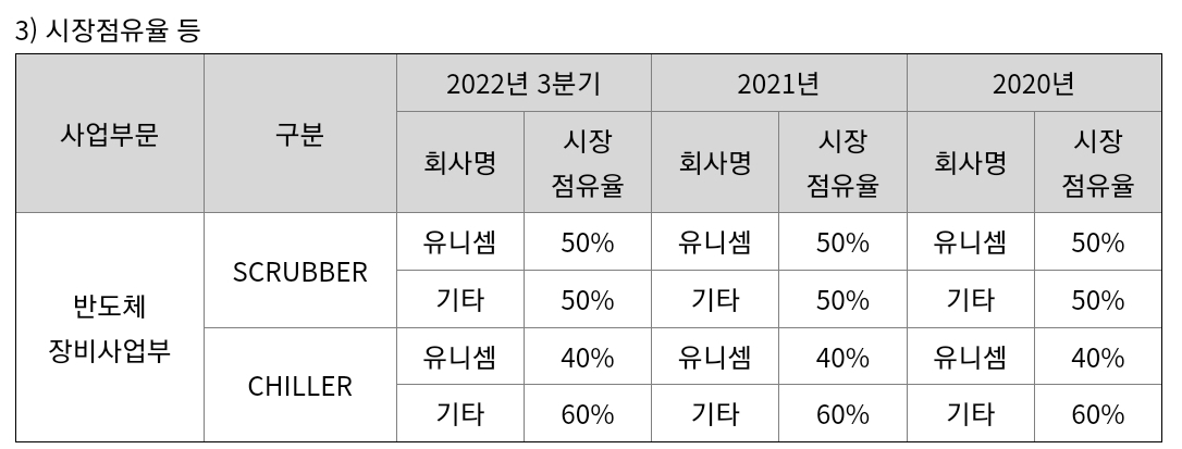 유니셈은 반도체, 디스플레이 공정 중 필수적으로 발생하는 유해가스를 제거하는 스크러버(Scrubber)를 제작 및 판매합니다. 또한, 뜨거운 온도에서 제작이 들어가는 반도체, 디스플레이공정은 열을 식혀주는 것이 굉장히 중요한데요. 이 열을 식혀주는 칠러장비 또한 동사가 양산하고 있습니다. 스크러버, 칠러 모두 반도체향 판매가 80% 이상을 웃돌 정도로 반도체장비에 크게 의존하고 있는 것이 특징입니다.