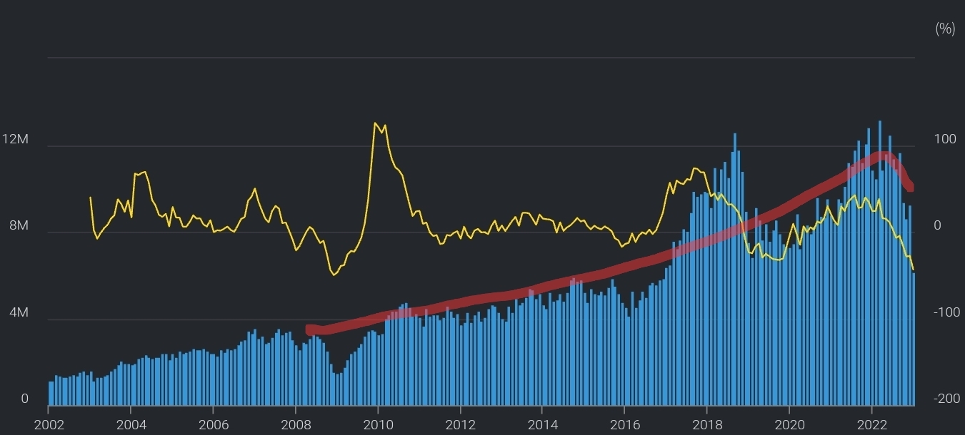 한국 반도체수출금액 추이 : 계속 우상향 중이다가 22년 경기악화로 하락 중