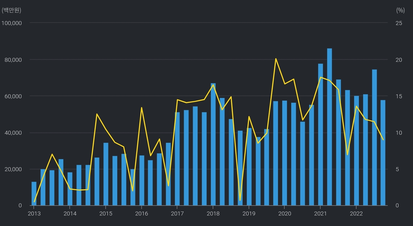 매출액 우상향 + 영업이익률 22년 경기악화로 하락 중