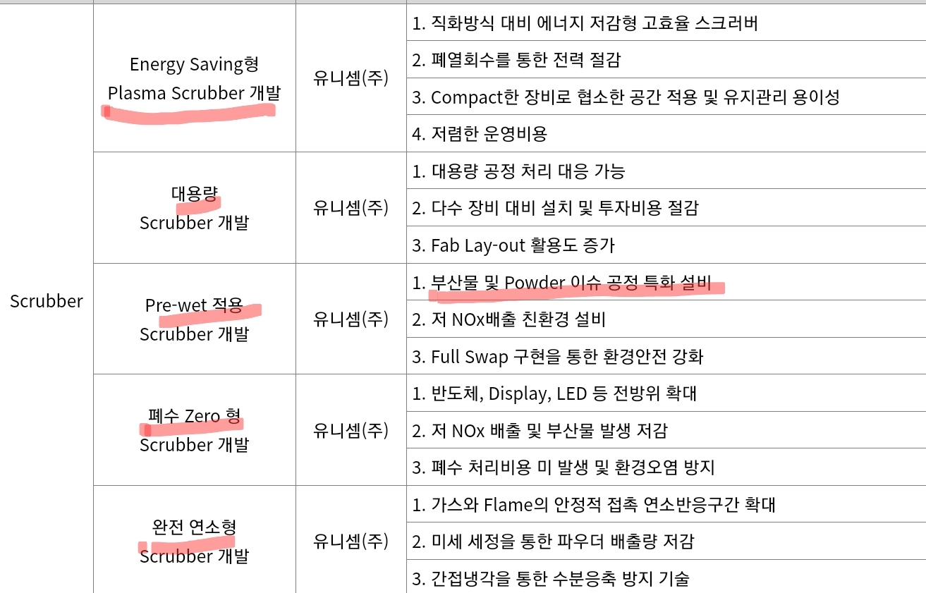 우선, 스크러버는 앞서 말했듯 점차 LNG기반으로 하던 Burn, Heat이 아닌 전기적 방식인 Plasma 스크러버로 전환디고 있다고 설명했죠. 처음 연구가 그것을 증명을 하고요. 그리고, 반도체가 대용량 예를 들면, 3D 낸드 같이 적층해서 쌓다보니 한 꺼번에 많은 유해가스를 처리해야하는 과제가 생겼는데, 이에 대응하기 위핸 대용량 스크러버를 연구개발한 것으로 보여요. 그리고, 친환경을 의식했는지 폐수Zero, 완전연소형 스크러버도 보입니다.