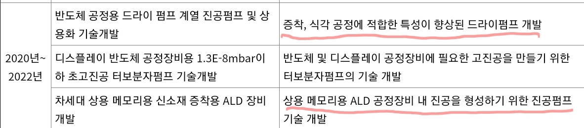 앞서 설명했듯, 반도체 전공정에 속하는 증착, 식각공정에서 주로 진공장비가 쓰인다고 했죠. 첫 번째 연구개발을 보면, 좀 더 친환경적인 건식펌프를 볼 수 있어요. 두 번째로는 터보분자펌프인데요. 터보분자펌프는 고진공을 형성하는데, 대기압에서는 작동이 안돼요. 그래서, 주로 대기압에서 작동하는 건식펌프를 사용하였는데, 반도체공정이 점차 미세화되다 보니 터보분자펌프의 필요성도 생기기 시작했어요. 그래서, 관련한 기술개발한 것으로 보여요. 참고로, 시장규모는 건식75%, 터보25% 입니다.