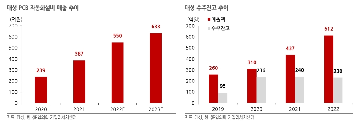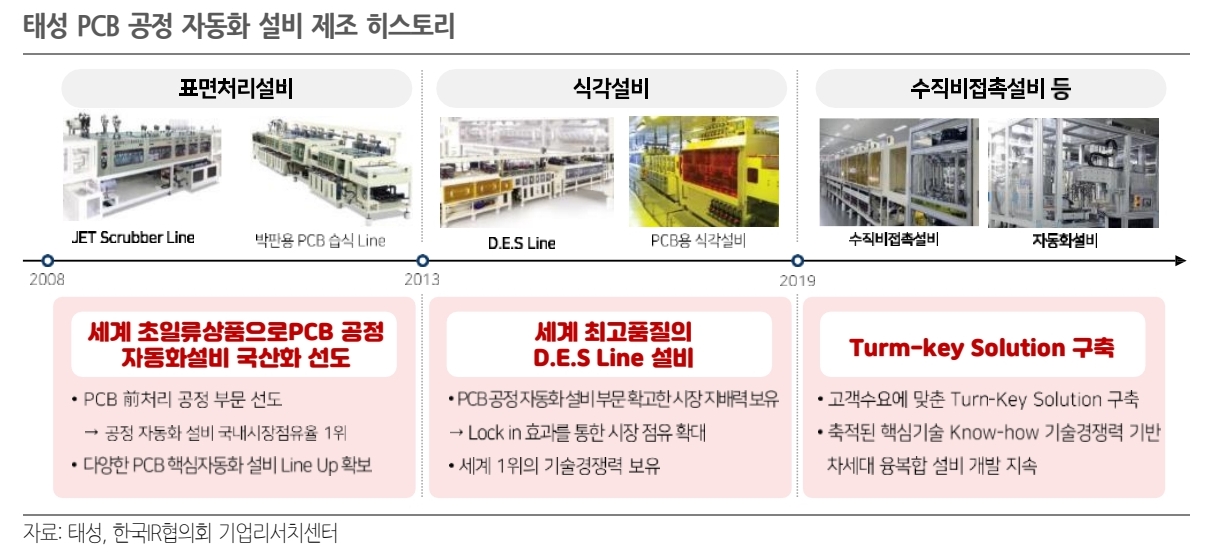 태성은 PCB 공정 자동화설비 전문업체입니다. 특히, 습식(Wet)설비에 대한 Turn-Key방식을 보유하고 있으며 습식설비 중 식각, 표면처리 관련 자동화설비가 주력제품입니다. 주요 고객사로는 PCB 제조업체인 삼성전기, LG이노텍, 대덕전자, 펑딩(폭스콘 자회사, PCB 1위업체) 등이 있습니다. 매출액 중 60% 이상이 FPCB향 설비에 집중되어있는 것이 특징입니다. 또한, 2차전지, OLED, 폴더블용 RF-PCB로 사업을 다각화하고 있습니다. 특히, 2차전지 동도금 장비를 2차전지 제조사의 제작요청을 받은 상태이며 경쟁력있는 제품을 내놓는다면 앞으로 큰 외형적 성장이 있을 것으로 예상됩니다.