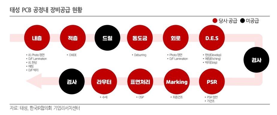 태성의 경쟁력은 위의 PCB공정내에 대부분을 장비를 공급한다는 것인데요. 기존 PCB장비사들은 일부 공정만 납품할 수 있는 Capa였는데요. 태성은 Turn-Key로 열쇠만 돌리면 처음부터 끝까지(물론, 검사과정을 제외하고) 가능한 솔루션을 제공하고 있습니다.