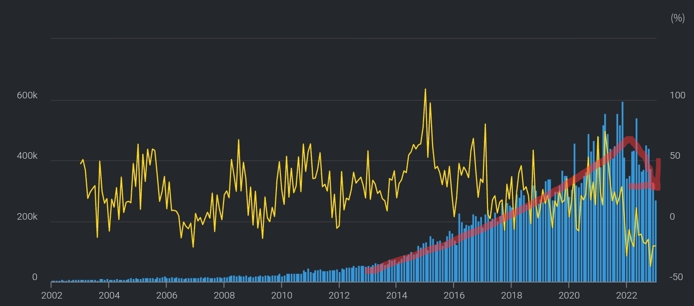 한국 화장품 수출액 규모 추이 : 꾸준히 우상향 하다가 22년부터 인플레이션 + 경기침체로 하락 중