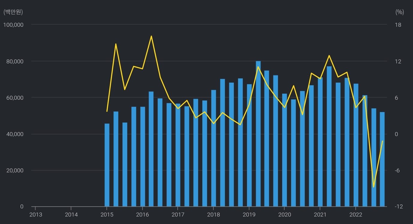 매출액 일정하다가 22년 경기침체 + 원재료비용 상승 등으로 적자전환